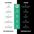 Wahrscheinlich hast Du schon etliche Schauermärchen über Decaf gelesen. Ungesund, krebserregend etc. etc. Darum entkoffeinieren wir ausschließlich mit reinem Wasser, sind Bio-zertifizert und rösten mit viel Liebe in kleinen Chargen. Das Ergebnis: Der erste Decaf der wirklich schmeckt, wirklich 100% unbedenklich und wirklich nachhaltig ist.