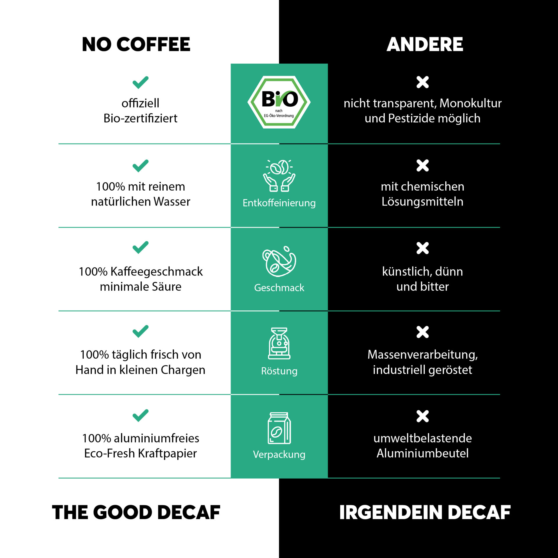 97% aller Kaffees werden mit Chemie entkoffeiniert. Dein No Coffee hingegen wird ausschließlich mit Wasser entkoffeiniert. Das ist nicht nur gesundheitlich 100% unbedenklich sondern sorgt auch dafür, das im Gegensatz zu allen anderen Kaffees, der Kaffee seine über 800 Aromen nicht verliert. Das Ergebnis: Der erste Decaf, der schmeckt!