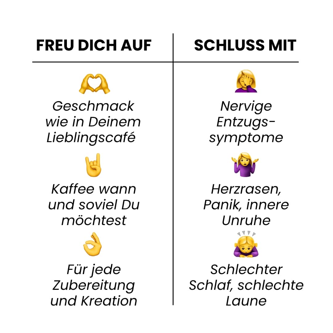 Sofort auf Koffein zu verzichten, kann anfänglich zu Nebeneffekten wie Kopfschmerzen, Unruhe oder Gereiztheit führen. Wenn Du darauf keine Lust hast, reduziere einfach Schritt für Schritt und der einzige Effekt wird purer Genuss sein.