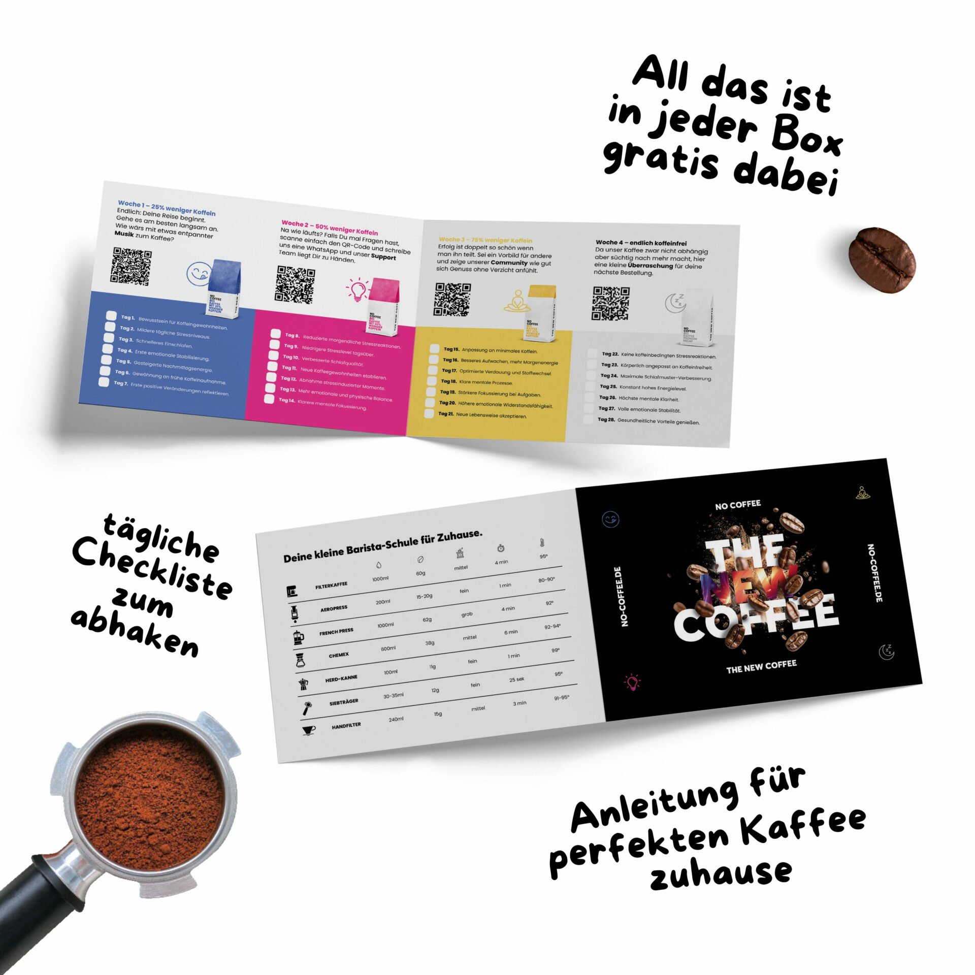 Du möchtest schon lange Deinen Koffeinkonsum in den Griff kriegen? Mit No Coffee kannst Du jetzt Schritt für Schritt erfolgreich sein. Starte bei 25% weniger Koffein und reduziere zu 50%, 75% weniger und zum Schluss komplett auf No Coffee ohne Koffein.