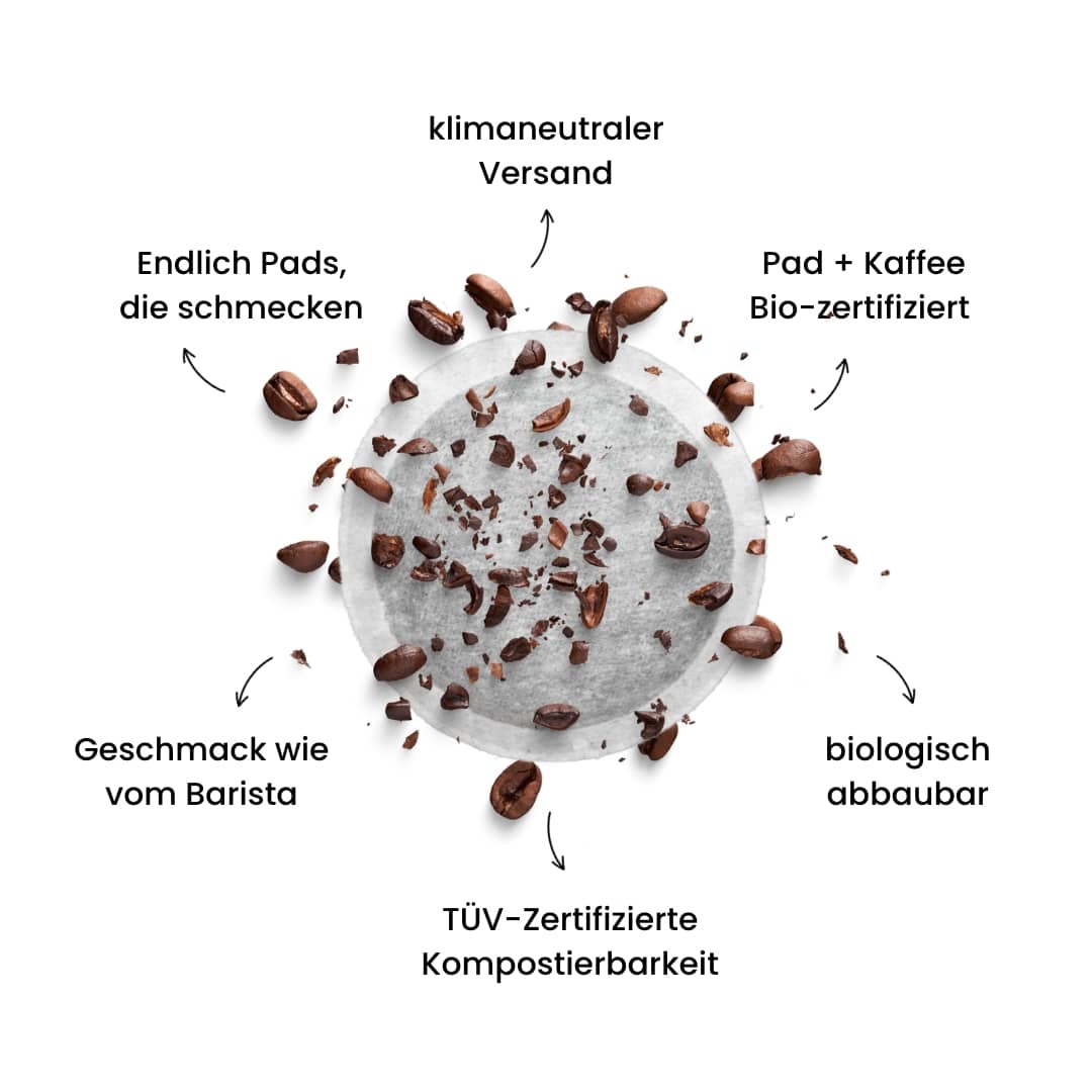 In allen Pads findet Ihr unsere Espresso-Röstung No Espresso. 100% sortenreine Bio-Arabica-Bohnen.