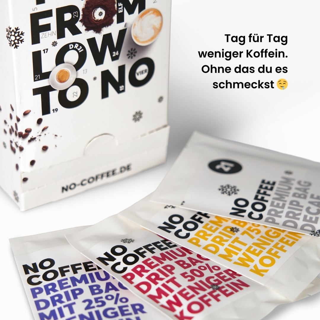 Du möchtest schon lange Deinen Koffeinkonsum in den Griff kriegen? Mit den verschiedenen Koffeinstufen der Drip Bags kannst Du jetzt Schritt für Schritt erfolgreich sein. Du startest bei 75% Koffeingehalt und ohne es zu merken, bist Du am 24. Dezember koffeinfrei und wirst nichts vermissen. Wenn nicht, bekommst du ohne wenn und aber dein Geld zurück.