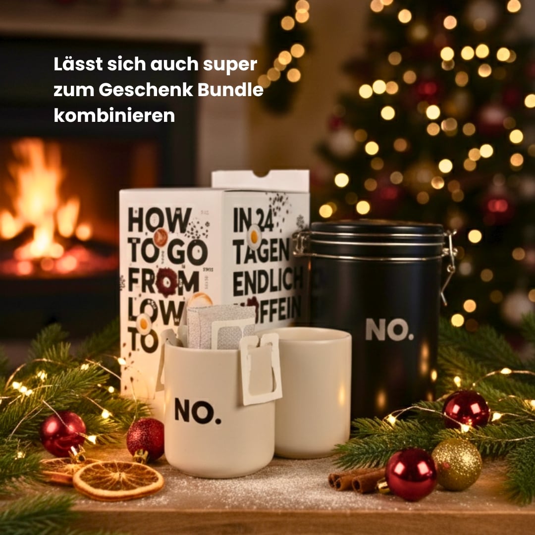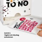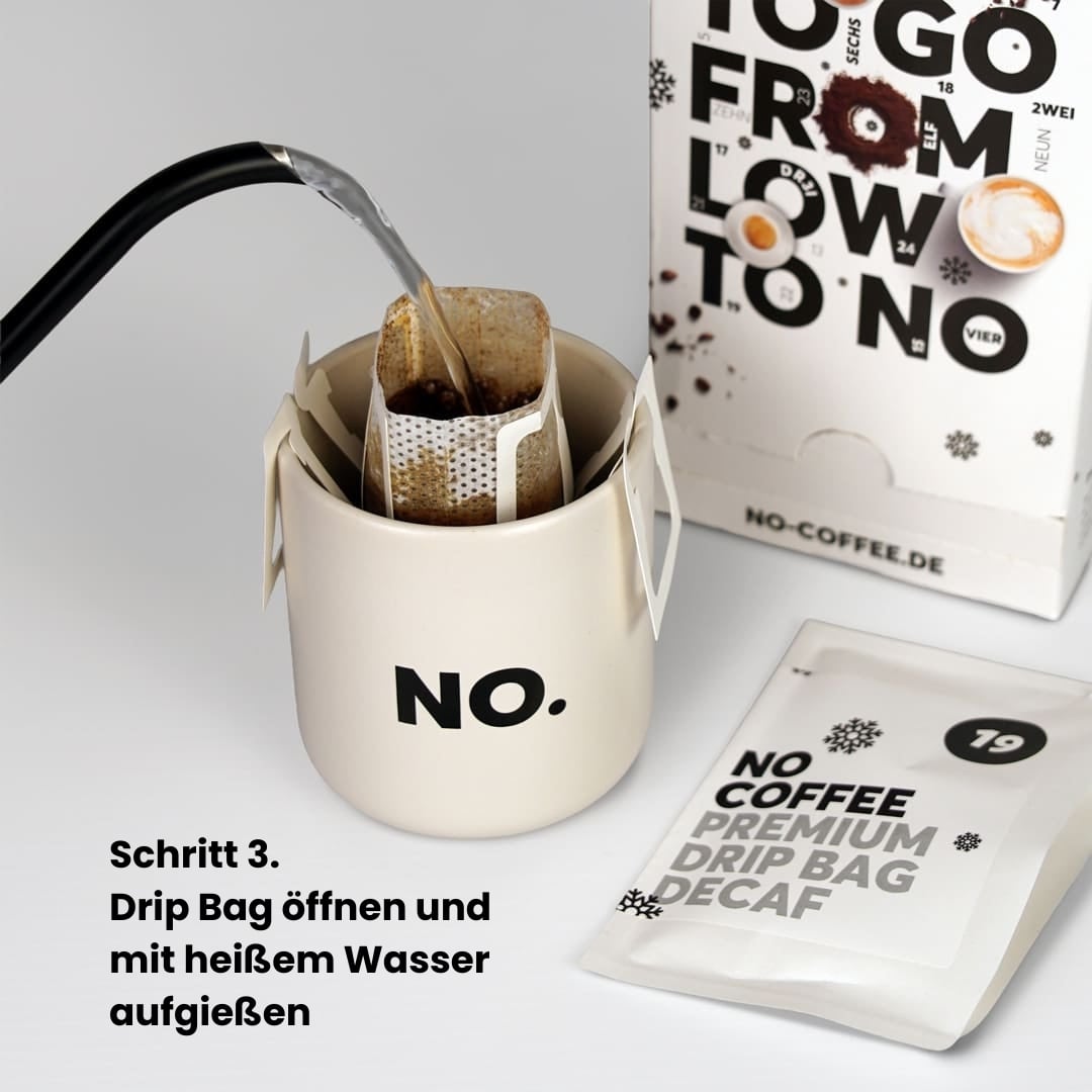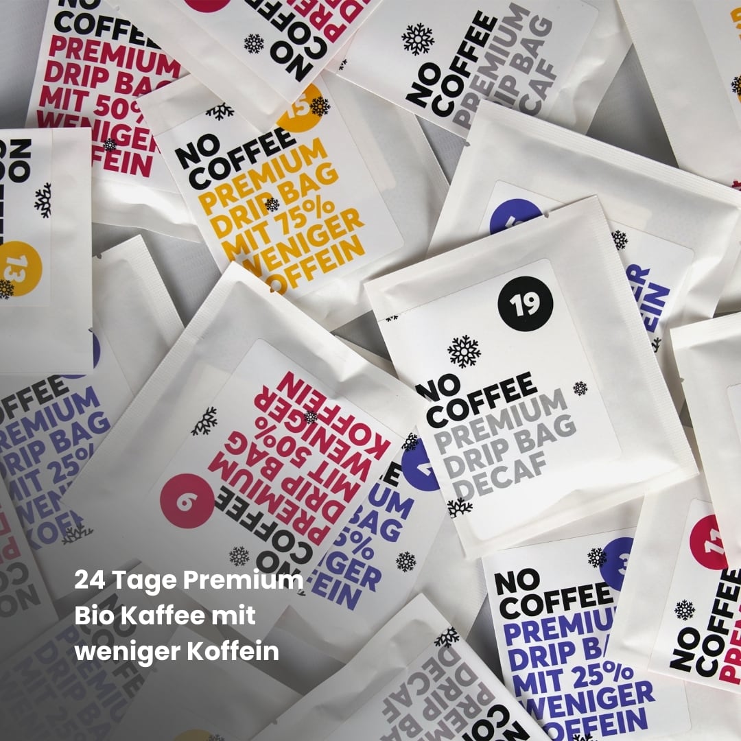 24 einzeln verpackte Drip Bags inkl. No Coffee mit 75% Koffein, No Coffee mit 50% Koffein, No Coffee mit 25% KoffeinIn und entkoffeinierten No Coffee