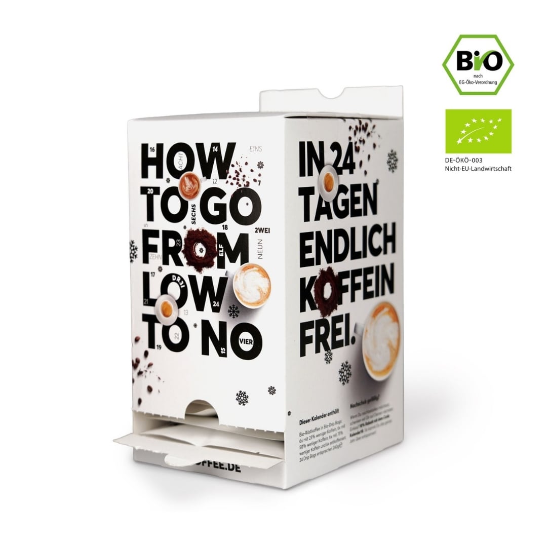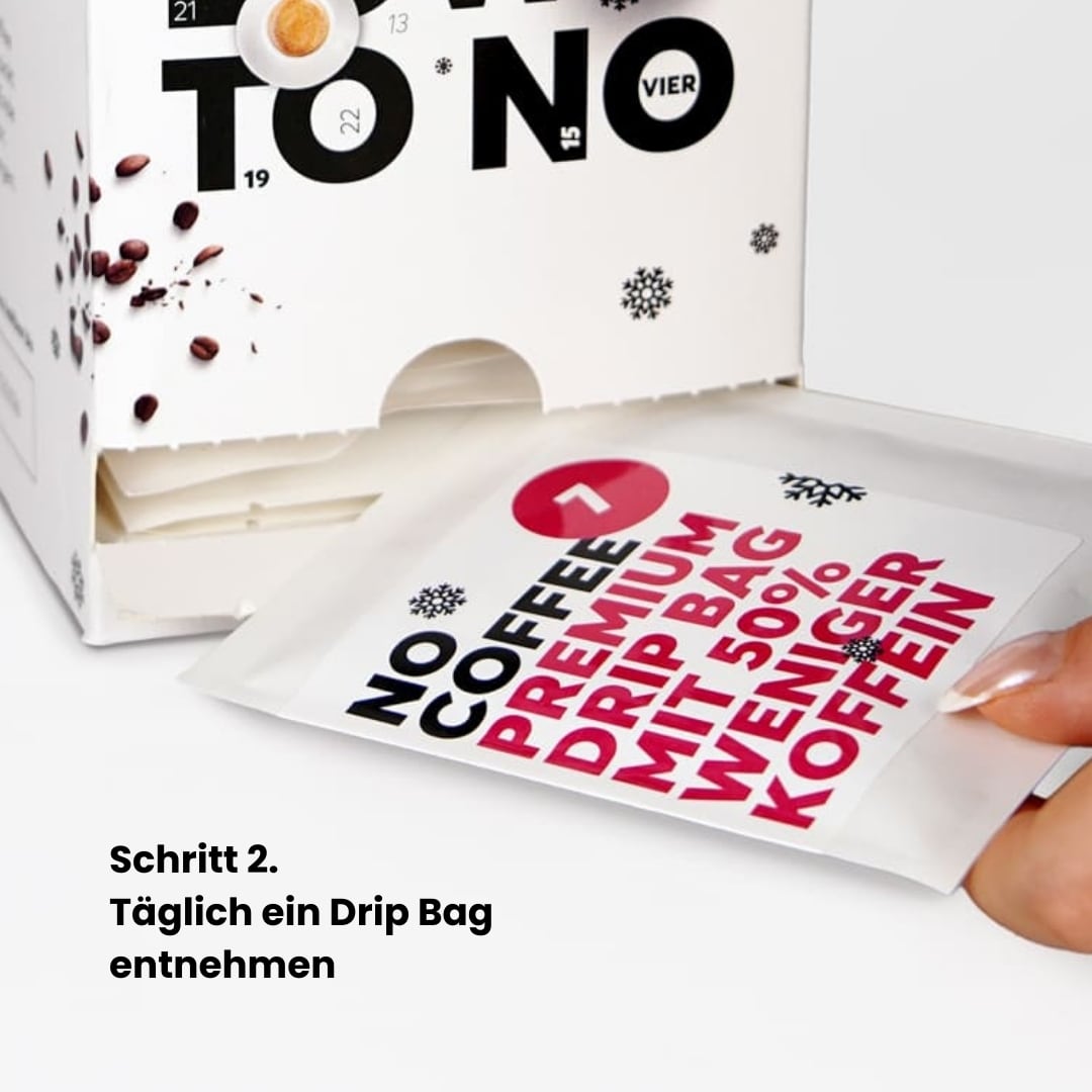 Für alle anderen: Du bekommst 24 einzeln verpackte Drip Bags in vier Koffeinstufen – 6x 25 %, 6x 50%, 6x 75% weniger Koffein, 6x Decaf. Alle 6 Tage sinkt der Koffeingehalt um deinen Körper ohne Nebenwirkungen an das neue Level zu gewöhnen. An Heiligabend bist du koffeinfrei ohne das du auf Kaffee verzichten musstest.