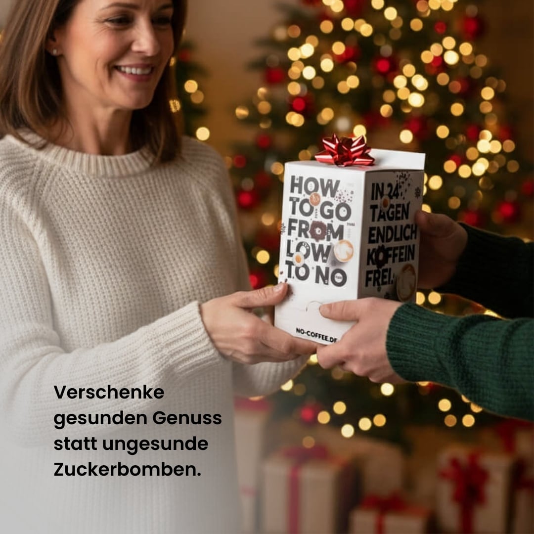Genieße den Advent ohne Zuckerfallen, Kalorienbomben und schlaflose Nächte. In 24 edlen Drip Bags sinkt alle 6 Tage der Koffeingehalt – bis du entspannt koffeinfrei bist und voller Energie ins neue Jahr startest. Zero Verzicht, maximaler Genuss. So wird 2026 dein Jahr!