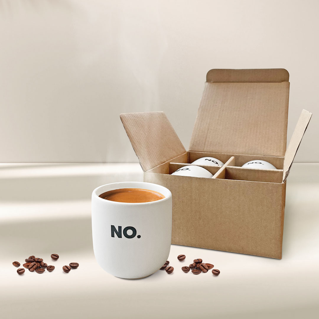 Schluss mit den 0815-Henkel-Humpen von der letzten Messe. So hochwertig und geschmackvoll wie dein No Coffee kommt nun auch deine neue Lieblingstasse daher. Minimalistisch und stilvoll. Und weil sichs in Gesellschaft doppelt so gut genießen lässt, bekommst Du die Tassen gleich im 4er-Set.